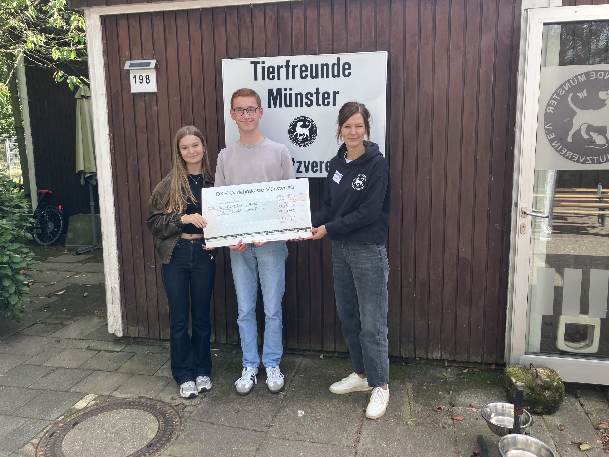 Am Wochenende hatten wir Besuch von der Friedensschule Münster. Vincent und Mailina von der Schüler*innenvertretung besuchten uns im Tierheim und hatten eine tolle Überraschung dabei: 250 Euro Spende!