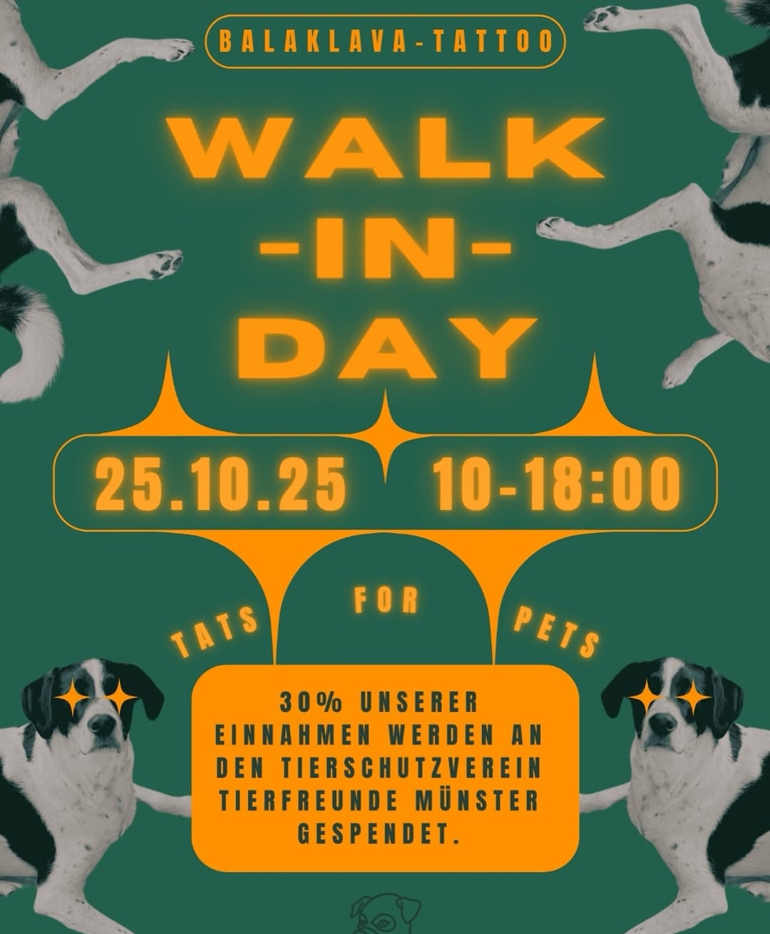 Am 25. Oktober lädt das Tattoostudio Balaklava in Münster zum Walk-in-Day ein. Von 10 bis 18 Uhr kannst du dir dort ein Tattoo abholen und dabei gleichzeitig etwas für den Tierschutz tun. 30 Prozent der Einnahmen gehen als Spende an unseren Verein.