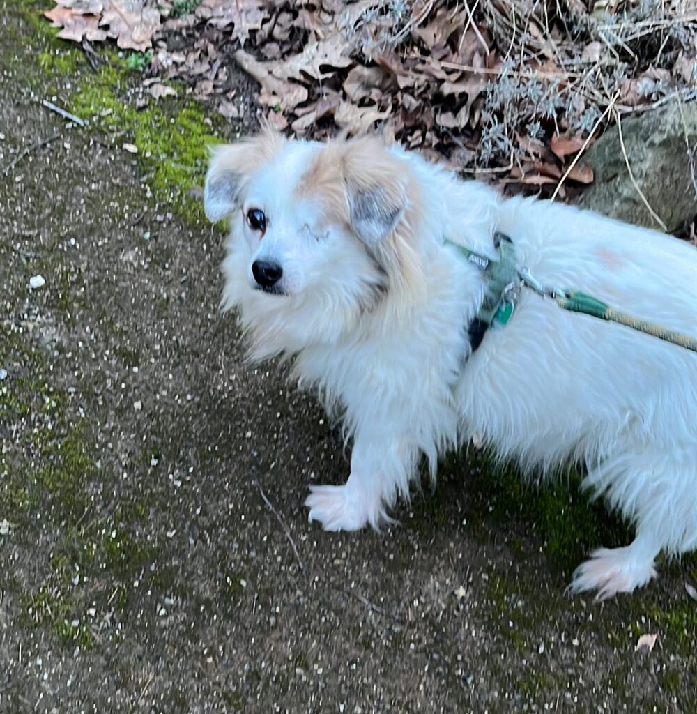 Das linke Auge wurde vor circa zwei Jahren operativ entfernt, daher lässt räumliches Sehen manchmal zu wünschen übrig. (Auch falls er mal an Möbel dotzt oder beim Gassi stolpert, er kommt allgemein sehr gut zurecht und bleibt fröhlich.)