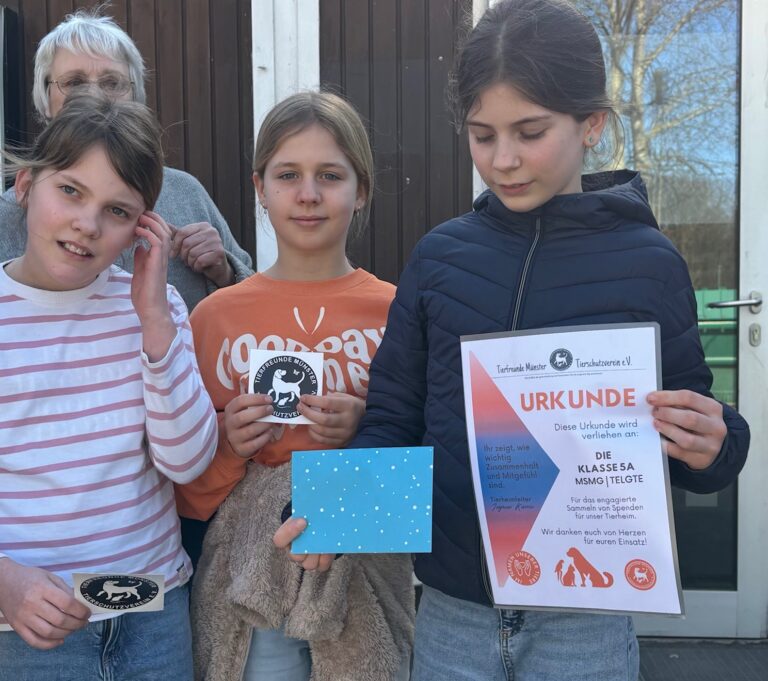 Die Klasse 5a vom MSMG in Tel­gte hat fleißig Kuchen verkauft und dabei 390 Euro ein­genom­men. Durch eine weit­ere Aktion kon­nte eine kleine Kinder­gruppe zusät­zlich 50 Euro ergänzen. Somit wur­den unserem Tier­heim am 1. März in einem hüb­schen Briefum­schlag ins­ge­samt stat­tliche 440 Euro übergeben.