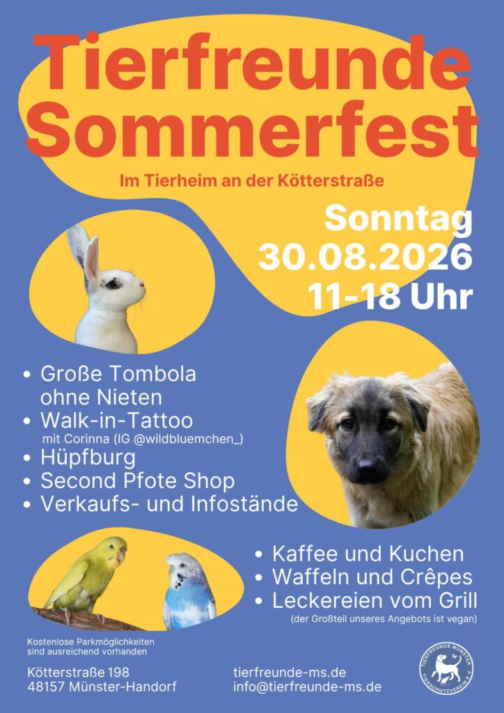 Wir freuen uns auf dich, deine Familie und Freunde beim Sommerfest der Tierfreunde Münster! Weitere Infos geben wir in den kommenden Wochen bekannt.